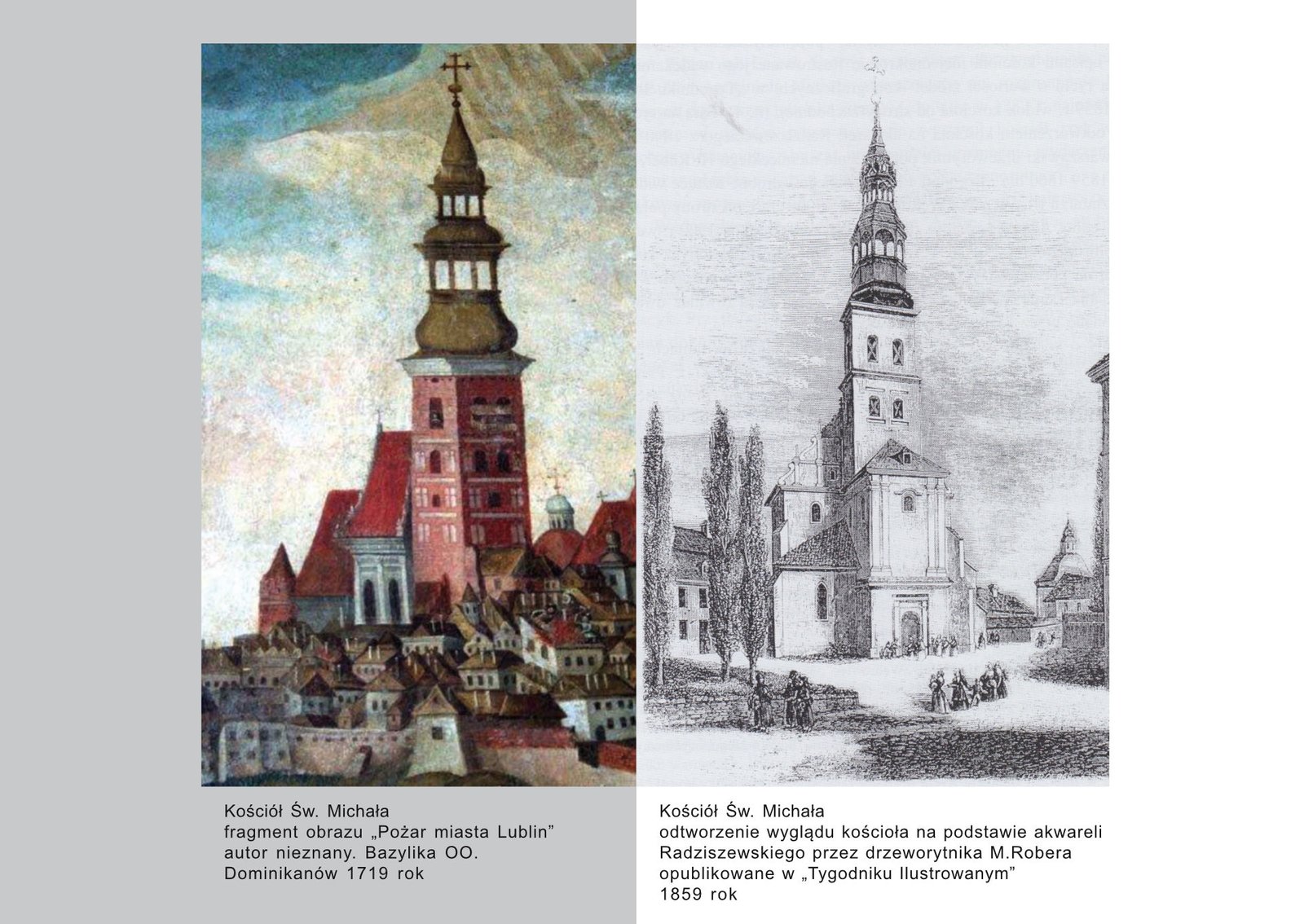 Kościół ufundowany przez Leszka Czarnego w roku 1282, jako wotum ofiarne ku czci św. Michała Archanioła po zwycięskiej bitwie nad Jadźwingami wg. legendy opisanej w „Rocznikach” Jana Długosza. Przez stulecia zmieniała się bryła, wyposażenie i status kościoła. Pierwsza przebudowa miała miejsce w XV wieku i wiązała się mi. z dobudowaniem wieży, najwyższego punktu ówczesnego Lublina. Kolejna rozbudowa nastąpiła w pierwszej połowie „złotego” XVII wieku. Zmieniono zwieńczenie wieży o wysokości 65 metrów, przebudowie uległo bogato wyposażone wnętrze budowli. W następnych latach w wyniku klęsk żywiołowych, zdarzeń związanych ze zmianą statusu lubelskiej fary i braku funduszy, postępuje powolny proces niszczenia budowli zakończony podpisaniem umowy zatwierdzającej rozebranie kościoła w 1846 roku.