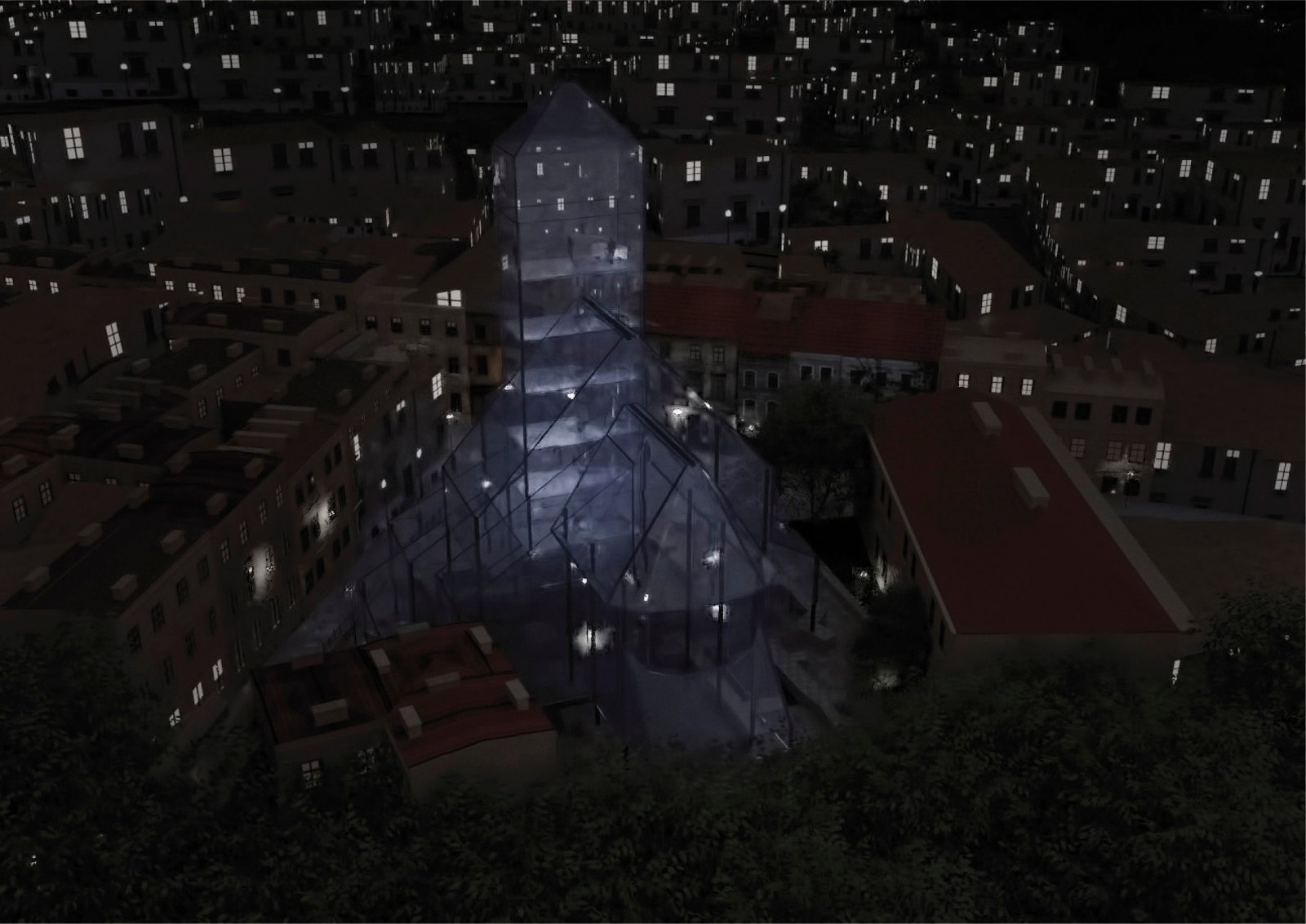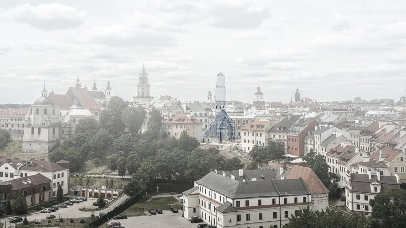 Panorama Starego Miasta w Lublinie z uwzględnieniem realizacji INSTALACJI RZEŹBIARSKIEJ GENIUS LOCI FARA LUBELSKA mogącego stać się symbolem miasta, multimedialną galerią – miejscem spotkań kultur i ludzi.