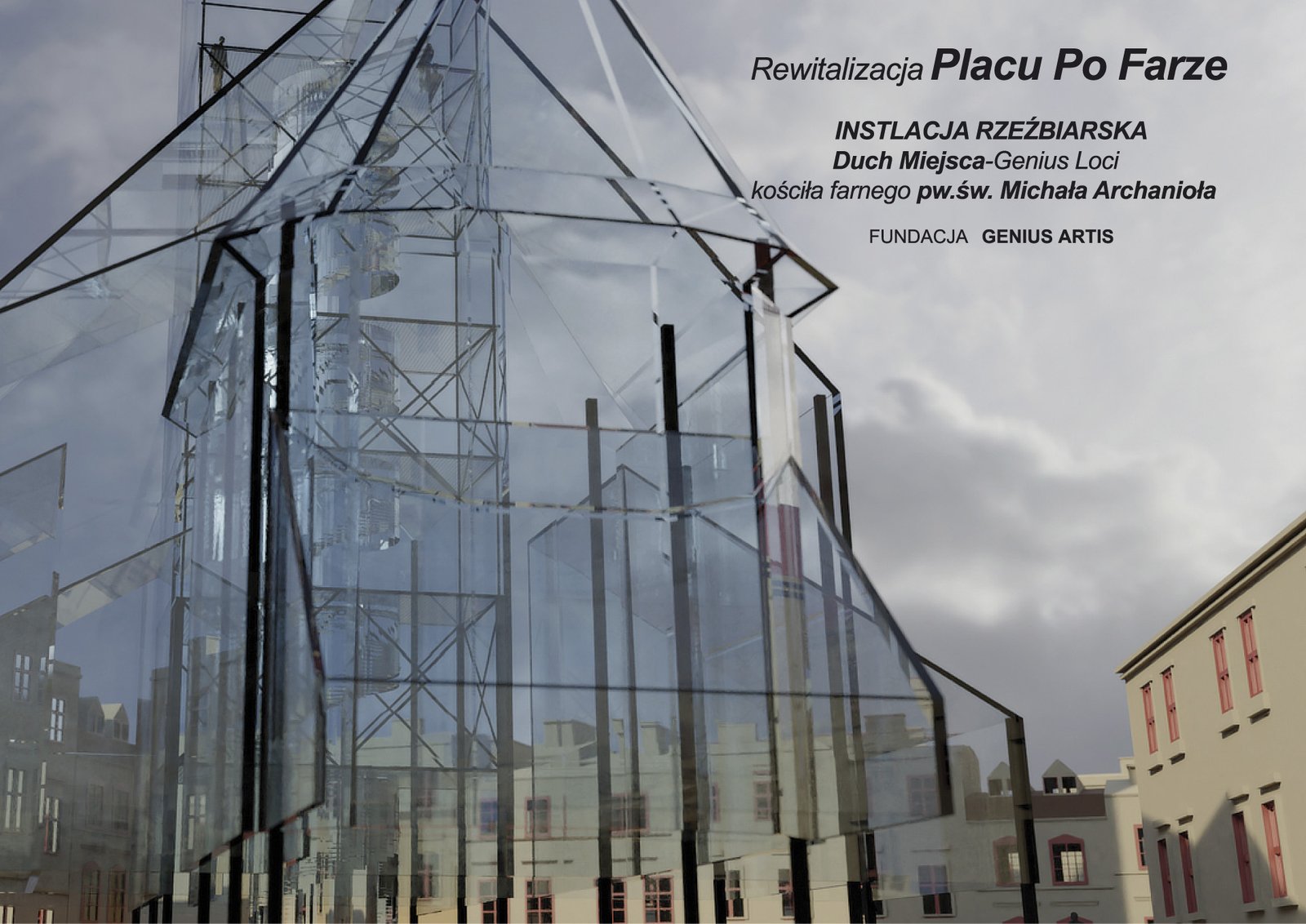 INSTALACJA RZEŹBIARSKA GENIUS LOCI FARA ŚW. MICHAŁA powstanie na Placu Po Farze, i będzie artystyczną interpretacją bryły historycznego kościoła. Filary konstrukcyjnie instalacji wyznaczały będą miejsca graniczne historycznej budowli wspartej o odtworzone fundamenty. Tafle szklane zostaną umieszczone około czterech metrów nad powierzchnią placu, tworząc wrażenie lekkości, unoszenia się całości założenia rzeźbiarskiego. Nawiązując tym samym pośrednio do wezwania dawnego kościoła Św. Michała Archanioła